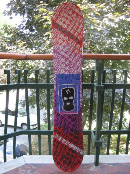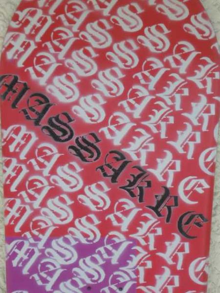 progetto grafico sul mio primo snowboard. scritta massakre in gotico grandezza 0,35 X 0,05. stencil centrale k attack grandezza 0,35 X 0,20 piu o meno. tempo di realizzazione quattro ore circa.tavola originale ghost byomorphyc da 1,55.